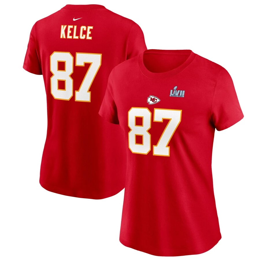 Women’s Kansas City Chiefs Travis Kelce Nike Red Super Bowl LVII Name & Number T-Shirt